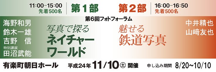 第6回の今回は、第一部でネイチャーフォトを3名の写真家が講演、写真というメディアについて特別講演、パネルディスカッション。第二部では鉄道写真について講演を行います。