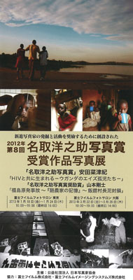 展示作品は「名取洋之助写真賞」の安田 菜津紀「HIVと共に生まれる-ウガンダのエイズ孤児たち-」(カラー30枚)、「名取洋之助写真賞奨励賞」の山本 剛士「福島原発事故~『酪農家の記憶』~飯舘村長泥封鎖」(モノクロ30枚)です。