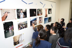 南舞岡2組撮影するテーマは「舞岡公園」と「自分の好きなもの」。公園で撮影したものは、同じ被写体に集中したせいか似たような写真が多かった。2回目の授業では、撮影者の名前を伏せて貼り出し、感想と作者の名前をあてるという授業にした。暗闇の中にボールを浮かせてストロボで止めたサッカー少年、大事な人形達を自分のベッドに並べて撮影した女子児童等の発想には驚かされた。「場所が違うだけで写真の雰囲気は凄く変わり写真は面白い」「写真は表情や気持ちが伝わって来る事を学びました」「いい写真を撮って飾ってみたい」等の感想にこのプログラムの実施の意義が感じられた。