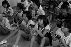 1回目、カメラの仕組みと教本をもとに注意点を話し、校内で何枚か撮影して残りを児童に託した。