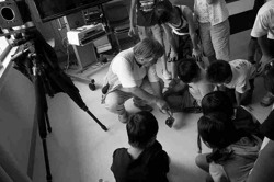 1回目、4×5ビューカメラを前に、仕組みを説明。カメラを渡して注意点を話し、校内で少しテスト撮影をして児童に託した。