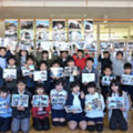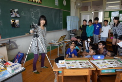 1回目はカメラとレンズの仕組みを説明。「写ルンです」の使い方練習を班ごとで行った。デジタルカメラを使い慣れているからか、フィルムを珍しがりつつも、スムーズにフラッシュの使い方など写真の撮り方をマスターしていた。2回目の講評会では「修学旅行を楽しく写そう」というテーマで撮った四つ切ワイドプリントを展示した。友達の笑顔が写ったプリントを見ている児童達は、楽しい想い出がよみがえり、自然と笑みがこぼれていた。意図していなくても、風景や建物など安定感のある上手な写真が撮れている子が多かった。いい想い出が残せたと素直に喜んでくれて何よりである。 (記/原田佐登美、撮影/小玉亘宏)