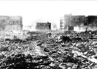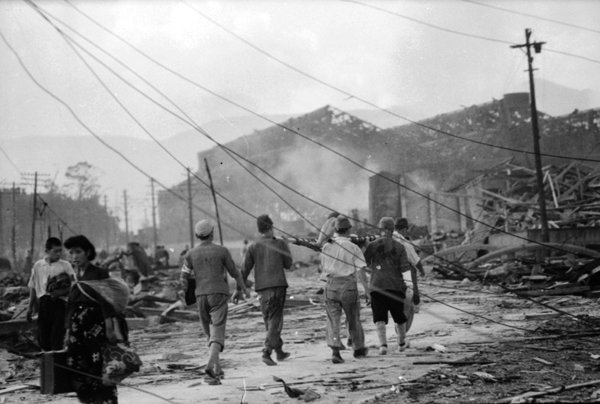 山端庸介「破壊された市電と死者」  山端庸介「負傷者を運ぶ」