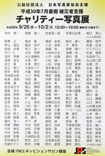 西日本、中部、及び多くの地域に未曾有の災害をもたらした「平成30年7月豪雨」による被災者支援のため会員作品によるチャリティー 写真展が現在開催中です。著名写真家のオリジナル作品を手にいれるチャンスです。奮ってご参加ください。