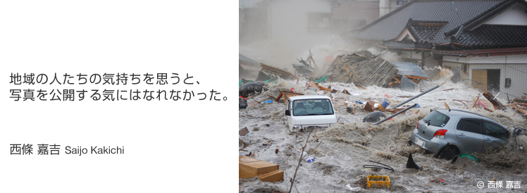 実は津波の写真を撮ったのを最後に、私はしばらくカメラを持つ気にはなれませんでした。慣れ親しんだ故郷はすっかり姿を変え、私たち家族も家と家財を失い、目にする現実すべてに心が押しつぶされそうだったからです。だから正直に言うと、津波の写真も誰にも見せたくはありませんでした。そこに写し出されている家も車も畑も、そのすべてが私の知り合いのものばかり。そもそも私は報道のカメラマンではないですし、そこに写っている被害を受けた物の持ち主である彼らの気持ちを思えば、私が撮った写真など公開できるはずもありません。