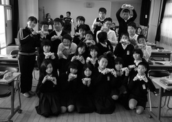 仕上った写真は、先生、友だち、家族などを多くの場所で撮った、表情豊かな動きのある楽しい人物写真が多かった。児童の感想の発表は6グループに編成して、一同に展示した写真を観賞後、話し合った。写真から感じた笑顔、季節感、面白かったことなどを一人一人が作品の前で解説した。