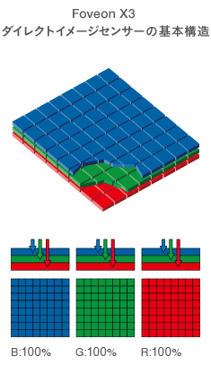 Foveon X3ダイレクトイメージセンサーは光の波長を短いほうから順に吸収するシリコンの特性を活かして、垂直方向に配置された3層(トップ、ミドル、ボトム)が短波長(主に青)、中間波長(主に緑)、長波長(主に赤)の光を捉えることで、すべての色情報を得ることができるフルカラーセンサーである。また、ベイヤー配列センサーと違い、RGBフィルターが不要で「色補完」を行わないため原理的に偽色も発生しない。そのため解像度を落としてしまう「ローパスフィルター」も必要なくなるため、非常に精緻でシャープ感があり、なおかつ自然な画像が生成できる。
