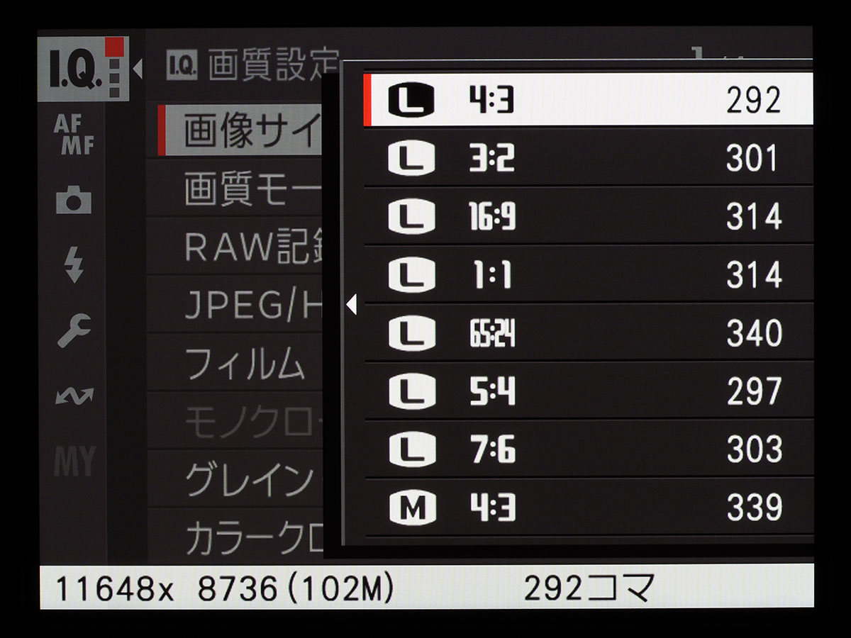 画像サイズは、L、M、Sの3つの中から、それぞれ7つのフォーマットが選択できる。最も高画素なLの場合、4.3で最高画素の1億200万画素が得られる。そして、上下が大きくカットされる65:24(パノラマサイズ)でも5000万画素が確保できる。