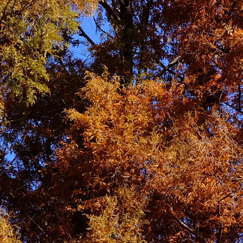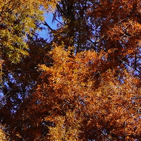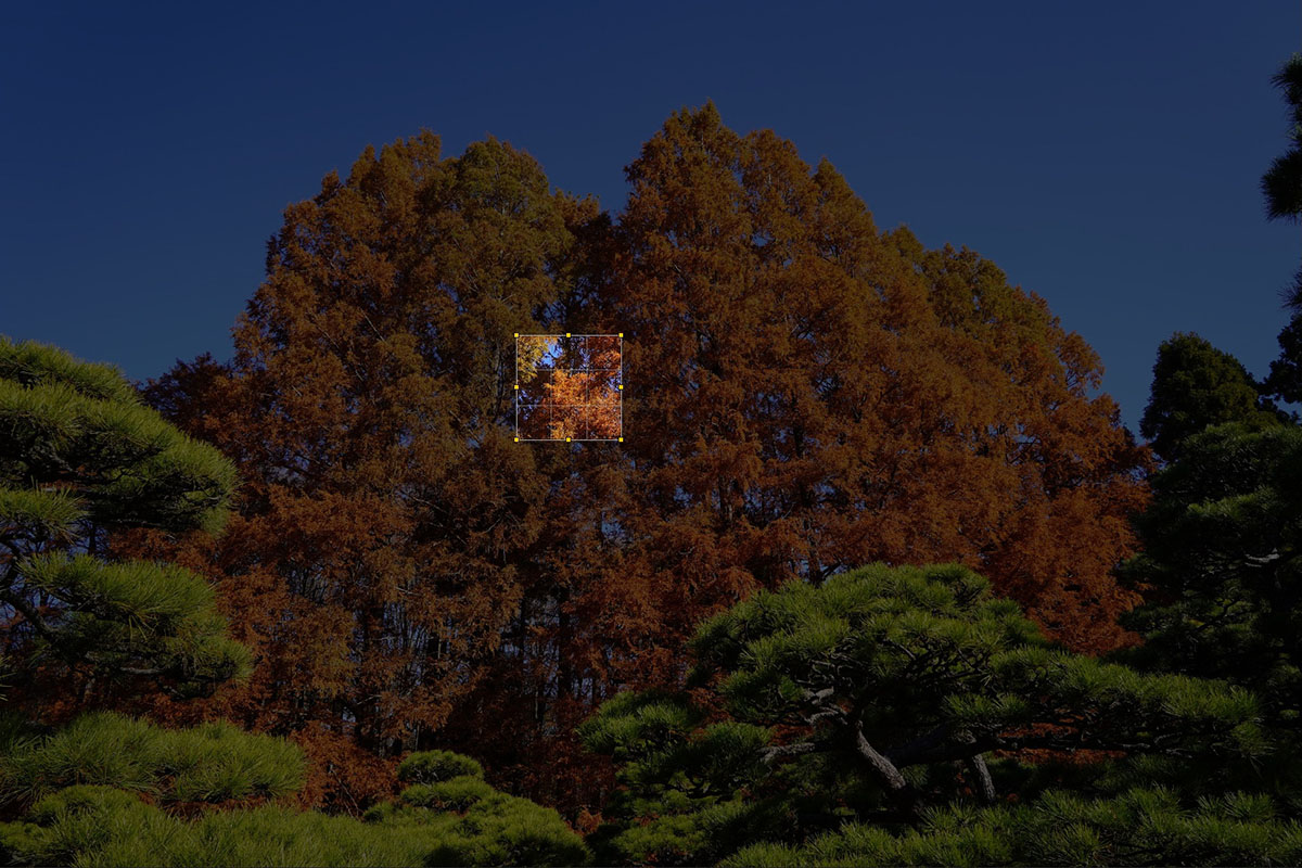 480×480ピクセルの範囲を切り出したもの。落葉針葉樹の密集している葉に、色彩や光と陰影によって立体感が確認できる。だが、細かい葉のひとつひとつまでは確認できない。