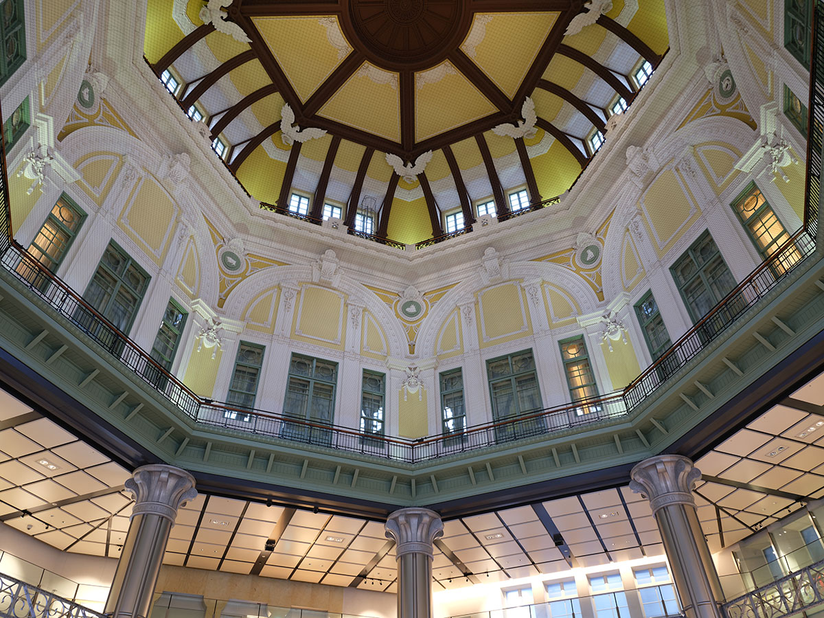 駅舎のドーム天井裏に施された見事な内装を、見上げるように撮影する。当然、三脚は使用できない場所だが「5軸・最大8.0段」の手ブレ補正機能に頼って、描写を考慮したISO感度・絞り値設定での撮影にトライ。1秒に近い低速シャッターになったが、微細なブレも防ぐ事ができた。
