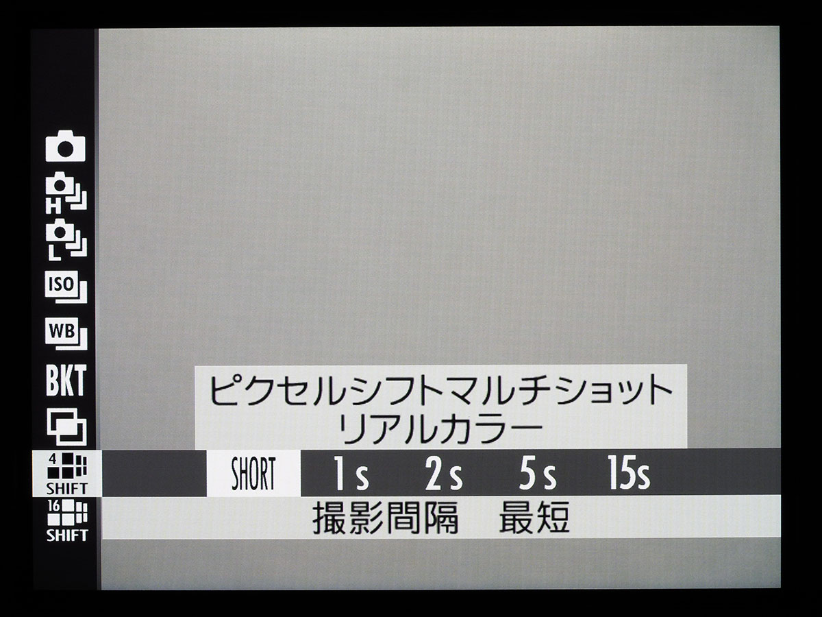 GFX100 IIの「ピクセルシフトマルチショット」の設定画面。これは4枚のRAWファイルを撮影する「ピクセルシフトマルチショットリアルカラー」を選択しているところ。生成画像の画素数は約1億画素だが、正確な色情報が得られて偽色を抑制する事ができる。