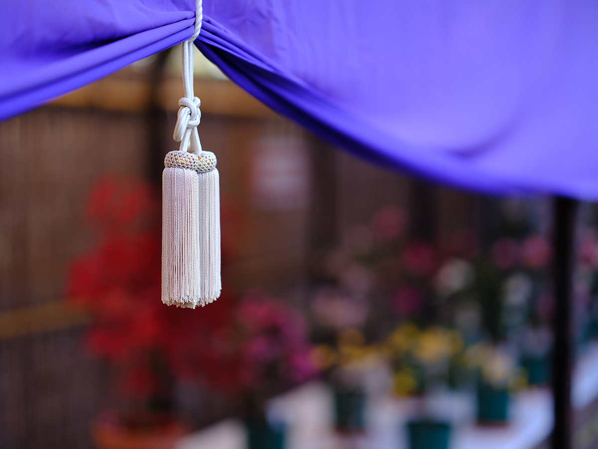 青紫色の幕をまとめる白い幕房を、大口径単焦点レンズで撮影。フルサイズでは中望遠にあたる焦点距離と、F1.8の明るい絞り値によって“自然な画角でボケ効果の高い”写真に仕上がった。