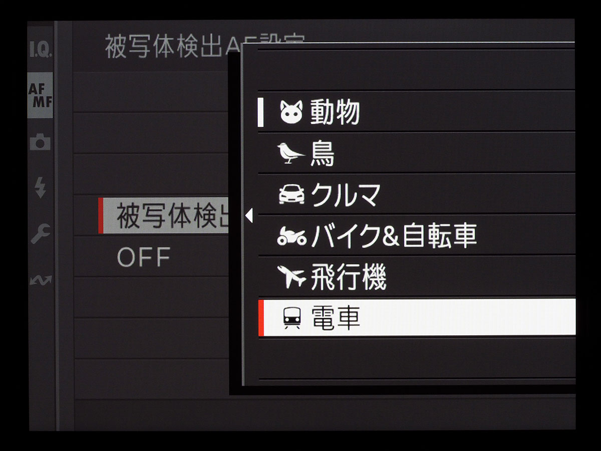 被写体検出AFの設定画面。「動物」では犬や猫、「鳥」では昆虫も、「クルマ」ではモータースポーツ車両や車両フロント部分、「バイク&自転車」ではライダー、「飛行機」ではコクピット・機首・ボディ・ドローン、「電車」では鉄道車両の運転室・車両前面。こういった被写体や部分を検出して、AFでピントを合わせる。