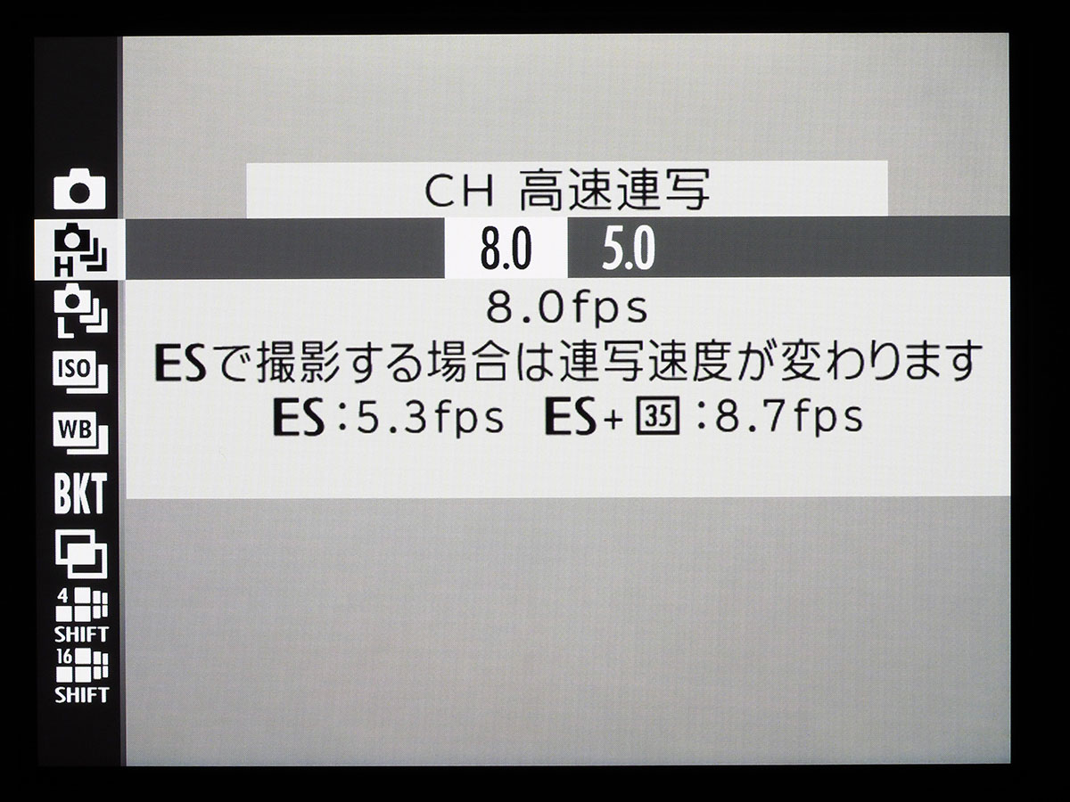 「CH高速連写」の連写速度は、シャッター方式や選択フォーマットにより変動する。メカシャッター選択時は「8.0コマ/秒」だが、電子シャッター選択時には「5.3コマ/秒」に落ちる。ただし、電子シャッターでも35mmフォーマット(フルサイズ)選択時には「8.7コマ/秒」の高速撮影が可能になる。