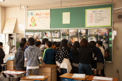 四切ワイドプリントを黒板に貼り、一人一人の写真に対して講評を行った。話の中で季節によって光と影の様子の違いや高さによる物の見え方などの説明に頷いて聞いていたのが印象的だった。