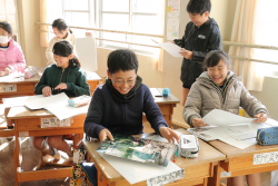 5年生の写真のテーマは「友人」。そこで自分の撮影した人物写真等を使って授業を始めた。真剣に説明を聞いてくれる表情が良い。カメラを持って外に出ると次々と質問が飛び出し、写真に対する興味の高さを強く感じ取る事が出来た。
