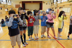 1回目の授業の前半は写真とは何か?デジタルカメラとフィルムカメラの違い、使用するカメラの使い方、撮影の注意点を大型モニターを使って説明した。後半はそれぞれ学校内の思い出の場所、写真に残しておきたい物を撮影に出た。フィルムの巻き上げには少々戸惑う児童もいたが、すぐに慣れ、フラッシュの使い方にも慣れてきたようであった。2回目の授業は、大きく引き伸ばされた写真を一点ずつ鑑賞したが、プリントの大きさに感動していたようだ。これを機会に写真を見ること、撮ることに興味をもつようになれば嬉しい事である。