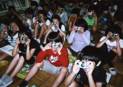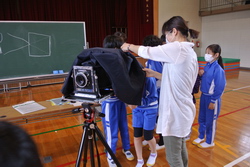 1回目は2時限分の時間を使って写真の仕組みや使用カメラの取り扱い、その後屋外での撮影を予定していたが当日雨天のため、体育館内で撮影を行った。撮影前に教室内の大型テレビを使って写真の写る仕組みやサンプル作品を使って良い例と悪い例の説明をした。フラッシュ発光の方法を説明したのだがスイッチの入れ忘れ、発光部前に指を入れてしまう児童もかなり多かった。