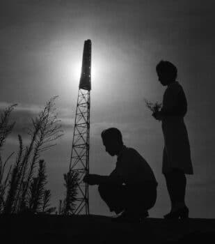吉田潤写真集「戦後フォーカス293 夢の輝き」より「広島中島 黙祷の花束を捧げる」