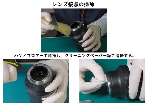 レンズ接点(カメラと通信させる箇所)清掃は、ブロアーで吹いてホコリを飛ばします。油などついてしまった場合は、シリコンクロスやクリーニングペーパー(激落ちカメラレンズクリーナー等)で清掃します。油がレンズ接点に付着していると、油のひまくや、手油による腐食によりカメラとの通信不具合等の原因になる場合があります。レンズ接点は指で触りやすい場所にありますので、取り扱いには注意が必要です。レンズの通信不具合等が起きた場合は、一度汚れの確認をしてみてください。