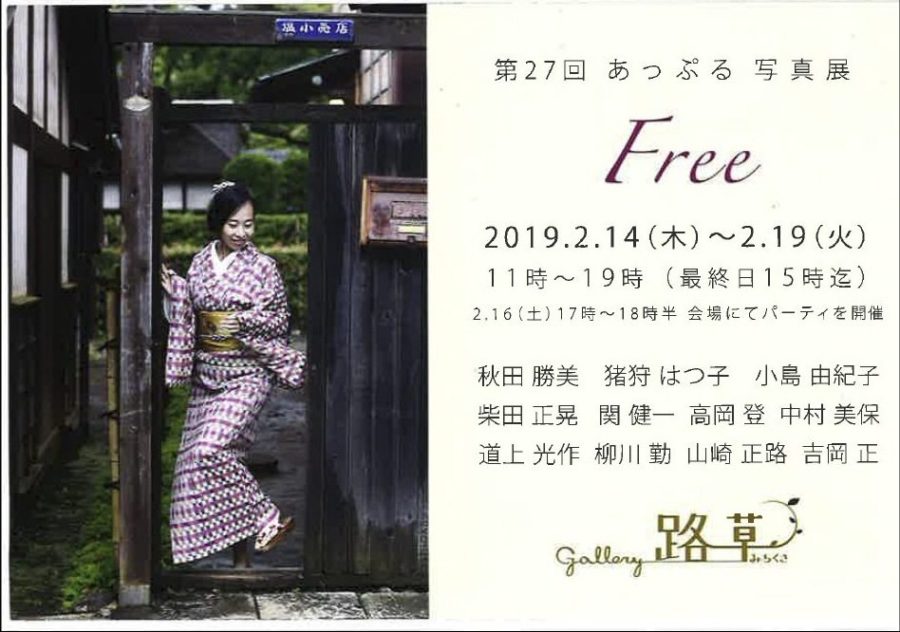 第27回 あっぷる写真展 写真創作集団「あっぷる」は1988年、日本写真学園OB会の有志が集まり結成されました。 今年(2019年)は創立31周年で27回目の写真展となります。しかし、母体である1967年創立の日本写真学園は残念ながら2005年4月に閉校となり38年の幕を閉じました。その後、旧職員の有志により四谷写真塾が発足し伝統を引き継いで14年になります。 「あっぷる」は現在も変わらず日本写真学園と四谷写真塾で学んだ者が集まり活動を続けています。