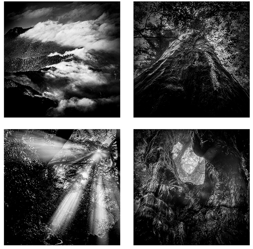 「癒やし」のイメージが先行する屋久島ですが、私は樹齢千年以上の巨樹を眺めていると威厳や尊厳そして恐れを感じました。その気配を捉えるためには縦も横もないスクエア、そして色情報をそぎ落としアンニュウイな質感を持つモノクロフィルムでこそ表現できると確信し撮影してまいりました。『Traces of Yakushima』は直訳すると屋久島の痕跡や踏み跡となりますが、私は「屋久島の気配」とさせていただきました。潤いのある森。人間とは異なる時間軸に生きる巨樹。自然こそ偉大な芸術家なのだと改めて思わせる造形美。それらにレンズを向け写し止めた作品です。過去に発表した作品「山岳島_屋久島」「RainyDays屋久島」とは異なる屋久島作品です。