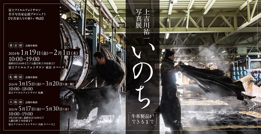 皮革産業の盛んな兵庫県たつの市で生まれ育ちました。初めて牛革財布の撮影依頼を受けたのは15年前。その後も依頼をいただく中で、どのような過程を経て牛革製品となっていくのかに興味が湧き、取材を続けてきました。食肉加工をするための屠畜場では目を背けたくなるようなシーンもありましたが、大切な命をいただいて生活をしているという事実にあらためて気付かされました。私たち消費者が目にするのは製品となった後ですが、その過程には多くの人たちが関わっています。写真展を通じてその人たちの思いとともに私たち人間は動物や生き物たちに生かされているということが少しでも伝わればうれしく思います。