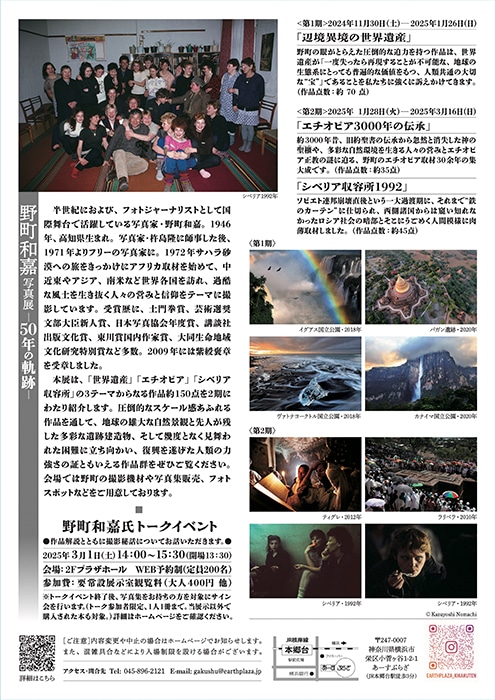本展は、「世界遺産」「エチオピア」「シベリア収容所」の3テーマからなる作品約150点を2期にわたり紹介します。スケール感溢れる作品に加え、野町の撮影機材の展示や写真集販売、フォトスポットなどもあります。地球規模で探訪の旅を続けて撮影した雄大な自然景観や先人が残した多彩な遺跡・建造物、そして幾度となく見舞われた困難に立ち向かい、復興を遂げた人類の力強さの証ともいえる作品群をぜひご覧ください。