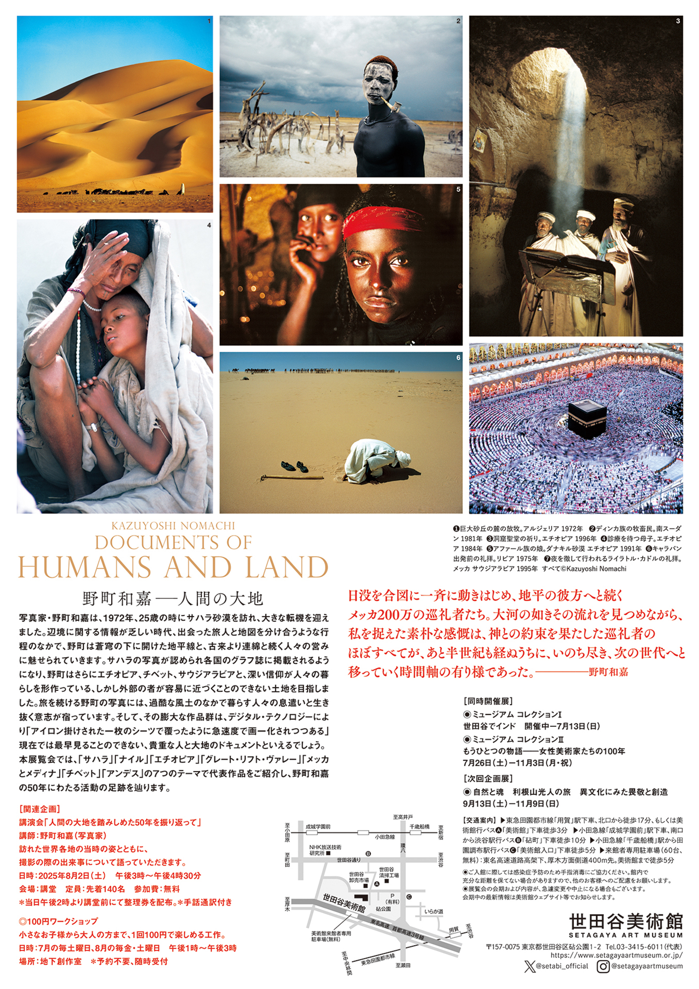 本展覧会では、「サハラ」、「ナイル」、「エチオピア」、「グレート・リフト・ヴァレー」、「チベット」、「メッカとメディナ」、「アンデス」の7つのテーマで代表作品をご紹介し、野町和嘉の50年にわたる活動の足跡を辿ります。