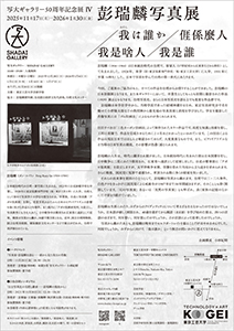 写大ギャラリーではこの度、写大ギャラリー設立50周年を記念して「我(わたし)は誰か/イ厓係麼人/我是啥人/我是誰」と題した彭瑞麟の写真展を開催いたします。タイトルは日本語、客家語、台湾語、國語(北京語)の順で、同一に「私は誰か」を意味しています。これらの言語のあわいを生きた写真家・彭瑞麟のアイデンティティへの問いかけです。