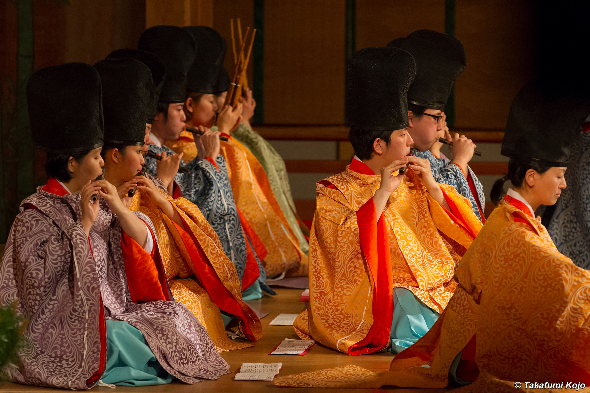 1200年以上の歴史を持つ雅楽は、現存する合奏音楽としては世界最古といわれるが、21世紀の今日、結婚式場や寺社仏閣等でその音を耳にすることはあっても、実際の演奏活動に接する機会は限られている。しかその音色や舞が絵空事ではなく、現実のものとして存在すること、またそれをこれから先も伝えようとする人々がいることを伝えることで、雅楽が生まれた時代に思いを馳せることは可能だ。作者は「雅楽」の演奏・伝承活動を続ける京都・いちひめ雅楽会の活動と出会い、2009年よりその活動を追い続けてきた。演奏活動に長期間密着することにより、いにしえの歴史を持つこの音楽を伝える人々がいること、そしてその活動を記録することが、いずれ「歴史絵巻の一部」になると考えた。悠久の歴史に比すると極めて短期間に過ぎないが、古代と現代が入り混じる京都の地で育まれてきた音、そして姿をぜひ多くの人に見ていただきたく、写真展開催の運びとなった。