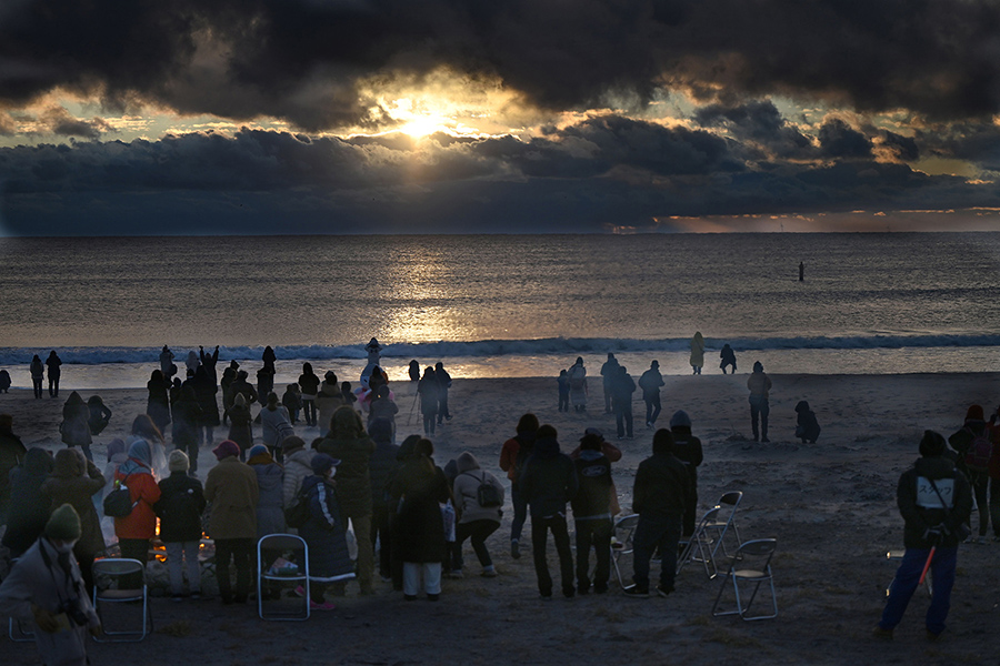 今年の正月元日。福島県浪江町で行われた元旦恒例のイベント「あるけあるけ初日詣大会」。10年ぶり震災前と同じ請戸海岸をゴールとするコースが復活した。初日の出に集まった人たちが犠牲者への鎮魂と復興への願いを込めて祈った=2021年1月1日