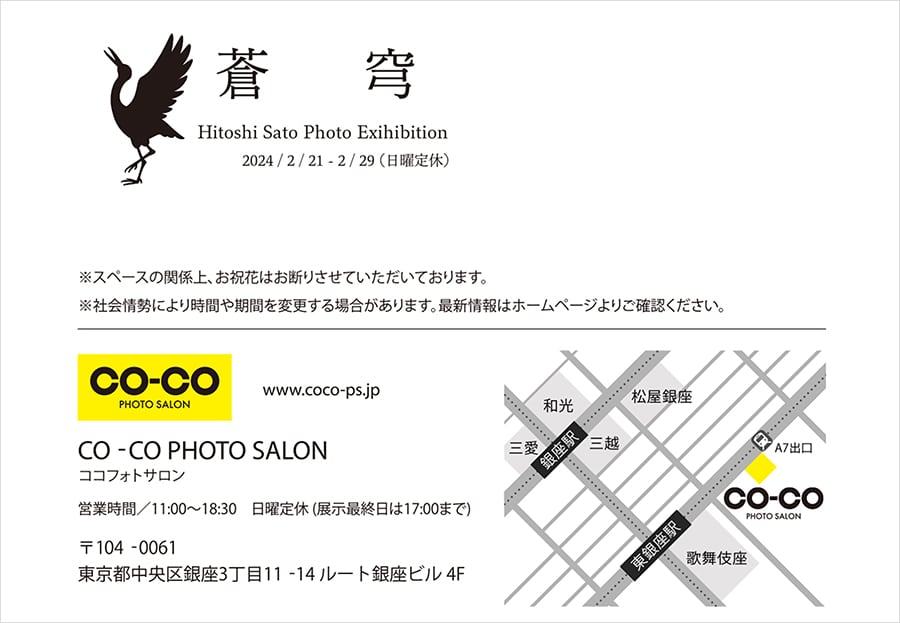 会 場:CO-CO PHOTO SALON 〒104-0061 東京都中央区銀座3丁目11-14 ルート銀座ビル 4F TEL:03-3542-7110
