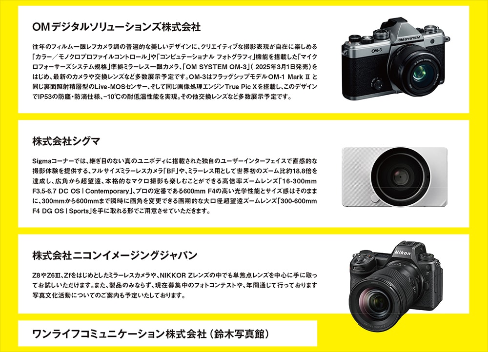 出展企業:OMデジタルソリュージョン株式会社/株式会社シグマ/株式会社ニコンイメージングジャパン/ワンライフコミュニケーション株式会社(鈴木写真館)/株式会社大仙/ロカデザイン企画株式会社