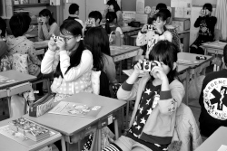 2回目は黒板に8名ずつ四切ワイドの作品を掲示して、作品鑑賞と講評を行う。今回、児童は「私の大切なもの」というテーマで撮影をした。多くの児童は家族やペット、ぬいぐるみや模型など、身の回りの人や物を捉えた和やかな作品を撮影でき、写真撮影での対話や観察の大切さに気がついたようだ。また、他の児童の作品に対する関心も高く、活発な意見交換が行われた。授業の最後に、私の東日本大震災での取材の経験より、大切な写真はプリントしてアルバムを作ることを児童に勧めて授業を終えた。