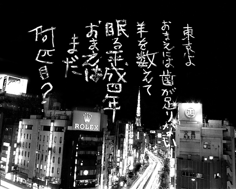 One of the benefits of being a photographer is the opportunity to meet interesting people, especially when working for magazines. Taking portraits are unique moments to talk one-to-one with the subject while looking through the lens. A different type of collaboration is working on a combined project with another artist. Creating as a team brings out results beyond one’s own imagination. It was particularly true when I was a doing project with film director Sion Sono. We were looking for interesting locations in the city to post his poems; projected on large monitor at a busy intersection, on a school playground where children were playing, and written on a window overlooking the city. We were challenging each other to come up with new ideas.