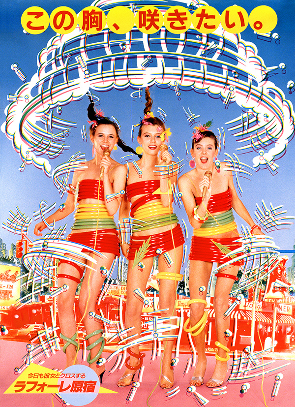 衣装もデザインして撮影した LaForet(原宿) の看板は、当時イラストレーターとして活躍中だった西哲氏との共同作品