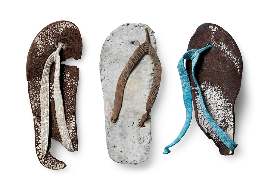 In 2003, I moved from Tokyo to the beachside community of Hayama. Being in a new location, opens the doors to new experiences and I started beach combing. In addition to picking up driftwood and shells, also collected bottles, cans, beach sandals, and other manmade trash that wash up on the shore. Other items include the inner core of dissolved dry cell batteries, along with disposable lighters and other plastics which do not decompose. These artifacts are microcosm our modern society and examples of the impact that we are having on the environment. Brought back to the studio, they are the subjects of my latest series, NATURE CALLS. Beach combing started off as playful activity, before my growing concerns about man’s footprint on nature.