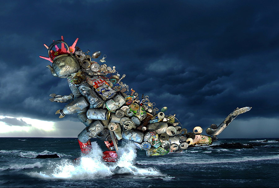拾った缶で作った怪獣。EAST MEETS WEST の象徴として CANZILLA とネーミング。 CAN(缶)とGODZILLA(ゴジラ)を合わせた造語