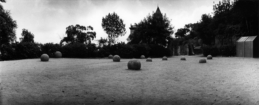 この時から13年を経た1977年に再びバルセロナに撮影に向かかいました。この13年という月日で、私はガウディについてそれなりに学習をしたつもりでした。しかし、グエル公園の丸い石が設置されている広場で、ある事に気付いたのです。この空間は散歩者の行く手を遮るように石が配置されており、右か左に行こうとするとまたそこに丸石がある、といったパズルのような空間でした。まるで太陽の周りを惑星が一定の法則で回っていくような宇宙的秩序が存在していました。