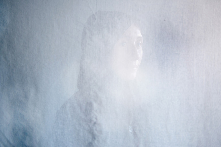 ISに一時拘束されたことがあるヤズディ教徒の女性。ISに姿を確認されないよう、ヤズディ女性が頭を覆う伝統的な白いスカーフ越しに撮影した。同じ境遇にあるヤズディの女性たちが他にも数多くいる。目を凝らして表情を見てもらい、その存在を感じてもらいたかった。