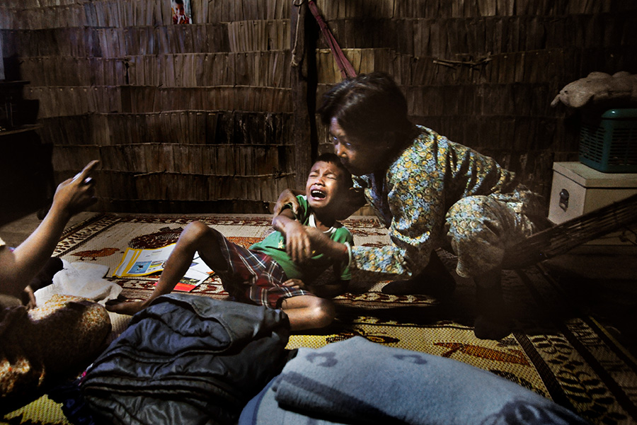 意思疎通ができずに祖母の腕の中で暴れるボンヘイ(2009年11月)©林典子