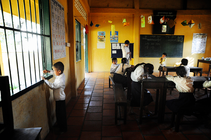 ろう学校での授業中に集中力がなくなり席を離れて、教室の窓格子に毛糸を巻きつけて遊ぶボンヘイ(2009年11月)©林典子