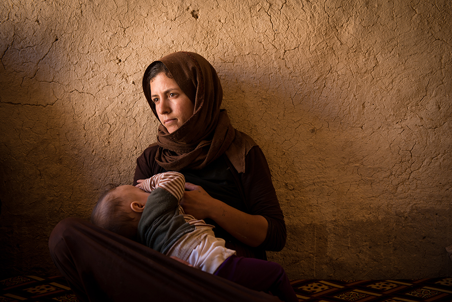 夫をISの戦闘員に殺害された19歳のズィーナ。 ビワ(クルド語で「家がない」という意味)と名付けた子供に母乳を与える(2015年6月)©林典子