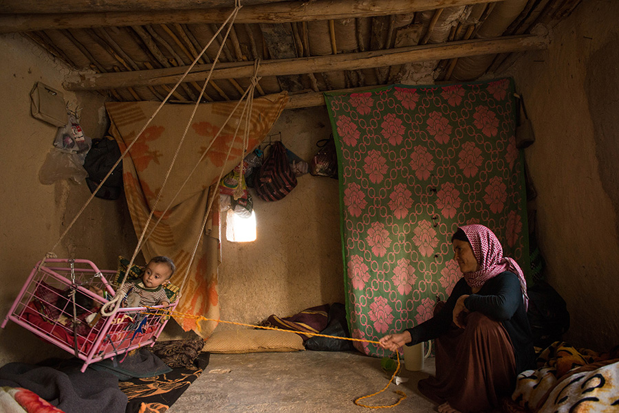 10ヶ月の息子をゆりかごに乗せてあやすズィーナの義母(2015年6月)©林典子