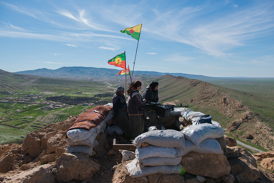 シリアやトルコなど国境を超えてイラクに入り、シンガル山の警戒にあたるクルド人女性兵士たち。3つの旗は、彼女たちが所属するPKK(クルディスタン労働者党)の軍事部門HPG (People’s Defense Forces) と、女性部隊YJA STAR(Free Women’s Units)、シンガル軍事部門YBŞ(The Sinjar Resistance Units) を表している (2015年3月) ©林典子