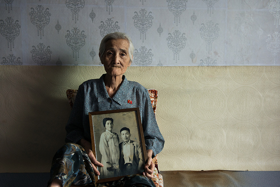 1961年に朝鮮民主主義人民共和国への渡航直前に夫と撮影した記念写真を手にする、日本人妻の井手多喜子さん(2016年8月、北朝鮮元山市で)©林典子