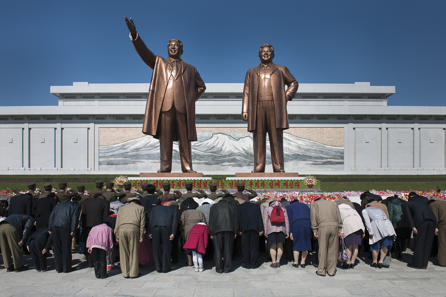 North Korea, Pyongyang – April 16, 2012: North Koreans bow to the newly unveiled statues of Kim Il Sung and Kim Jong Il in Pyongyang at the Mansudae Grand Monument. ©Mark Edward Harris