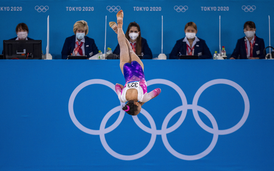 Tang Xijing of Team China performing a floor routine in front of judges on July 30 during the women’s individual all-around gymnastics final. ©Mark Edward Harris