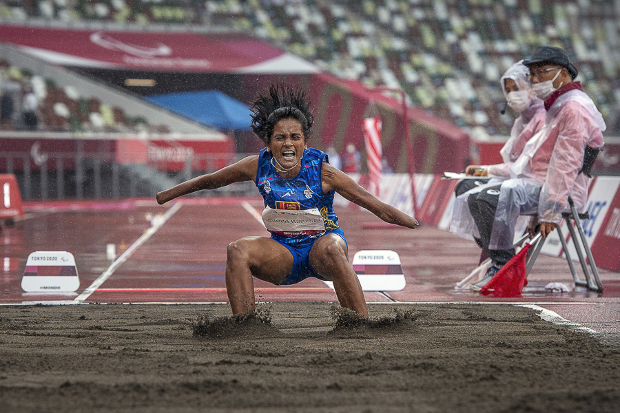 Sri Lankan Paralympic athlete Premadasa Dissanayake, who lost her hands and the vision in one eye after a hand grenade exploded in her hands when she was age 16, set a personal best of 4.92m in the long jump at TOKYO 2020. ©Mark Edward Harris